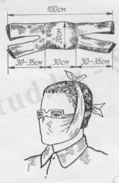 Тыныс жолдарының қарапайым қорғаныс құралдарына мақта-дәке таңғыштар мен шаң-тозаңнан қорғау маскалары (ПТМ-1) жатады (3-сурет) . Мақта-дәке таңғыштарды қолдан жасау үшін ұзындығы 1 м, ені 50 см дәке қиындысын алып, оның ішкі қабатына мақта салу керек те, қалыңдығы 1-2 см, ұзындығы 30 см, ені 15-20 см дәкенің мақтадан шығып тұрған шетін қайырып орау керек. Осылайша жасалған мақта-дәке таңғышты екі жағынан да қайырып ұзынынан 30-35 сантиметрдей қалдырып, қиып алады. Мақта-дәке таңғыштар ауыз бет-мұрынды толық жабатындай болуы керек. Міне, осындай қолдан жасалынған қорғаныс құралдары дұрыс пайдаланылса, адамның тыныс жолдары улы заттармен зақымданудан сақтай алады.