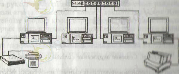 Бұл схемадан барлық компьютерлер бір-бірімен желіге арнайы құрылғы-коммутатор арқылы біріктірілгені көрініп түр, егер қандай да бір компьютерді өшіретін болсақ, онда ол желідегі басқа компьютерлердің жұмысына әсер етпейді.