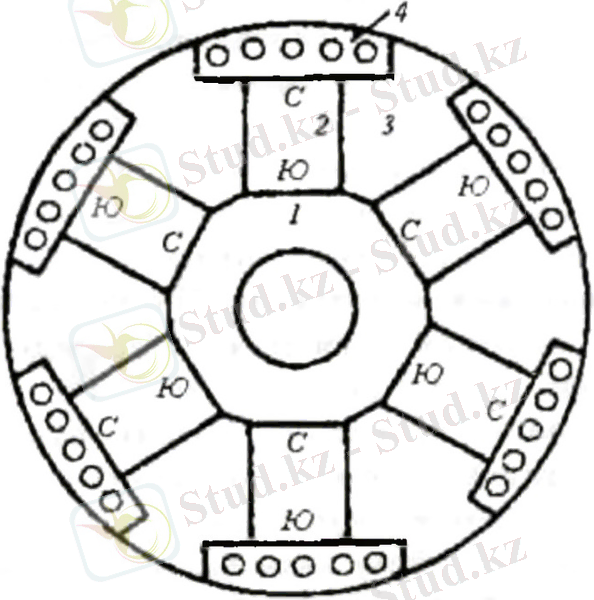 3-сурет. Алюминий құйылған тұрақты магниті бар сннхронды машина роторы: 1-болат төлке; 2-тұрақты магниттер; 3-алюмнннй құймасы; 4-қысқа тұйықталған торкөзді полюс ұштамалары.