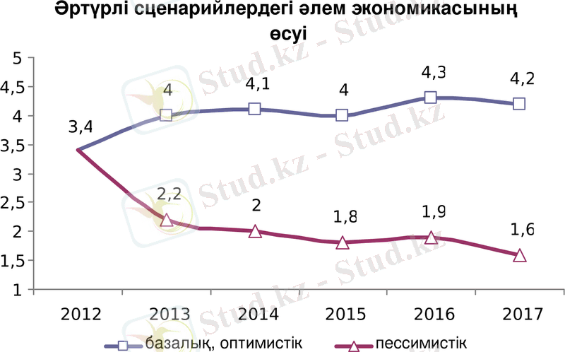 Пессимистік сценарий 2013 - 2017 жылдары әлемдік экономика өсуінің орташа алғанда ағымдағы болжамдардан 2% дейін бәсеңдеуін жобалайды.