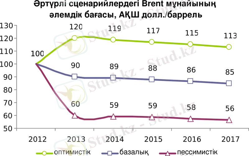 Шикізат тауарларының бағалары дамыған елдердің тарапынан да, дамушы елдердің тарапынан да өсіп келе жатқан сұраныспен нығайтылған жеткілікті жоғары деңгейде болады. 2013 - 2017 жылдары оптимистік сценарийде әлемдік мұнай бағалары, бағалау бойынша, бір баррелі үшін 120 АҚШ долл. деңгейінде болады.