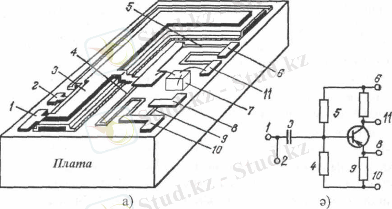 Басқа варианттағы бірлескен ИМС-тің негізгі диэлектриктік төселімді пленкалық ИМС болып табылады. Оған дискретті дайындалған активтік микрокомпоненттер қойылады (ілінеді) . Мұндай ИМС-терді гибридтік деп атайды. Күшейткіштік каскадтың гибридтік ИМС-нің жалпы түрі 1. 2, а-суретінде келтірілген. Диэлектрлік төселімге жұқа пленкалы әдіспен күшейткіш схемасының пассивті элементтері бекітілген (1. 2, ә-сурет) : конденсатор 3, резисторлар 4, 5 және 9, сол сияқты 2, 6, 8, 10, 11 түйіспе ауданшалары. Пленкалық бөлшектер - конденсатор, резисторлар, түйіспе ауданшалары диэлектрикті және металдарды термиялық әдіспен тозаңдату арқылы орындалған. ИМС-тің активтік компоненті корпуссыз транзистор (7) болады. Ол төселімге бекітіліп, схеманың тиісті нүктелеріне қосылады.