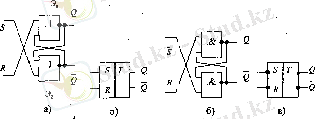 Қазіргі электроникада триггерлер логикалық элементтерге негізделіп микросұлбалық технология бойынша жасалады. 1. 1 а, б-суретте НЕМЕСЕ-ЕМЕС, ЖӘНЕ-ЕМЕС логикалық элементтерге негізделіп құрылған асинхрондық RS - триггерлер триггерлердің сұлбасы берілген. Ал 1. 1ә, в-суретте олардың шартты белгілері көрсетілген.