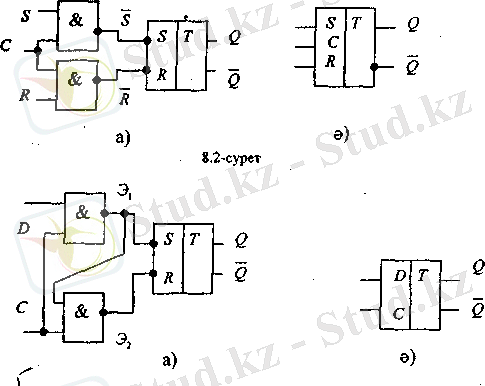 1. 2 а, ә-суретте И-НЕ логикалық элементтерге негізделіп құрылған синхрондық RS - триггердің сұлбасы және оның шартты белгісі көрсетілген. Синхрондық RS - триггердің асинхрондық тригтерден өзгешелігі - оның сұлбасында қосымша екі И-НЕ элементтері бар. Бұл қосымша элементтер сұлбаның синхрондаушы кірісіне «1» (С = 1) сигнал әсер еткен жағдайда ғана басқарушы сигналдарды және кірістерге жібереді. 1. 3 а, ә-суретте И-НЕ логикалық элементтерге негізделіп құрылған синхрондық D - триггердің сұлбасы және оның шартты белгісі көрсетілген. Мұнда ақпаратты қабылдау үшін бір кірісіне D - триггерді пайдаланған.