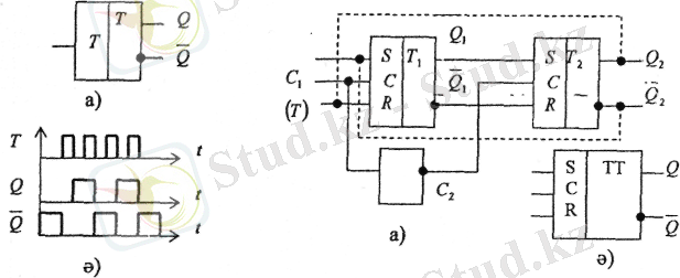 Мұндағы С 1 кірісті ( Т) ақпараттық кіріс ретінде пайдаланған. Сол себепті, Т = 1 болған жағдайда Т 1 триггердің күйі Т 2 триггердің күйі қарама-қарсы қалыптасады, мысалы Q 2 = 0, Q 2 = 1 күйге оның қарама-қарсы Q 2 = 1, Q 1 = 0 күйі сәйкес келеді. Ал егер Т = 0 болса, онда Т 2 триггер Т 1 триггердің күйіне сәйкес келетін Q 2 = 1, 2 = 0 күйге өтеді. Осылайша, Q 2 , 2 шығыс сигналдары 1. 4 ә-суретте берілген уақыттық диаграммаларға сәйкес тек кезекті Т импульстер аяқталған кезде ғана керісінше өзгереді.
