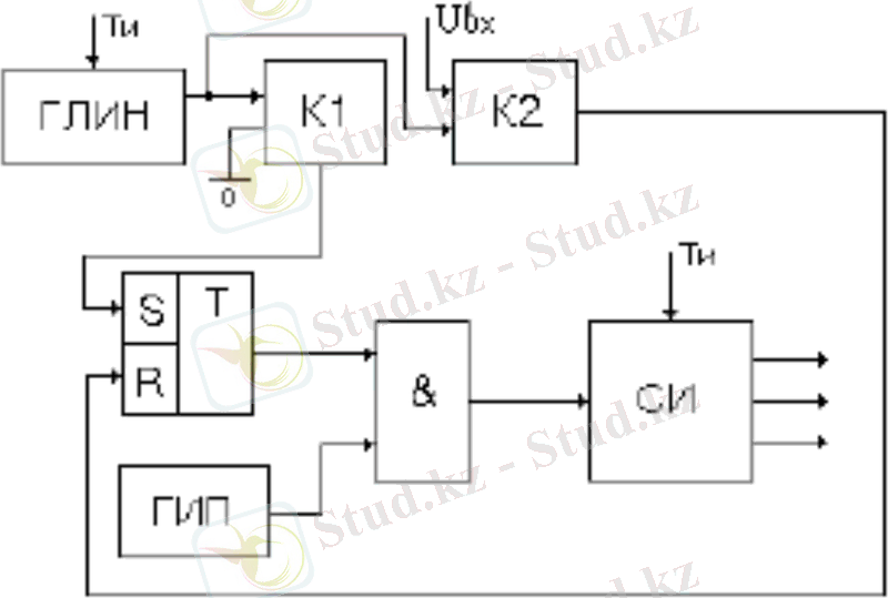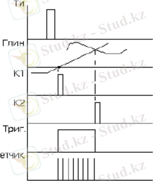 К1 және К2 компараторларында сызықтық өзгеру күшейткішінің генераторы кернеуі ―0-мен және U bx -пен салыстырулары өтеді (5-сурет) . Сызықтық өзгеру күшейткішінің генераторы кедергісінің деңгейі ―0-ге тең келгенде, К шығуында триггерді бірлік қалыпқа қоятын сигнал жабдықталады. ―N суретсында триггер шығысынан бірлік сигнал және импульстік жүйеліктің генератор шығысынан импульстер жүйелілігі беріледі. Импульстік жүйелік генераторының импульстері санауды жүзеге асыратын есептегішке жіберіледі. Араның кедергісі U bx -ке тең келгенде, К2 шығысынан импульстер ―U суретсынан өте алмау себебінен есептеу тоқтатылады. Өткен импульстер саны U bx -ке пропорционал болады, өйткені ―араның кедергісі қатаң түрде сызықты емес, бастапқы бөлікке келсек, қайта жасау нақтылығы үлкен емес. Үлкен нақтылықты ОС мен және қадағалаушы типі қамтамасыз етеді