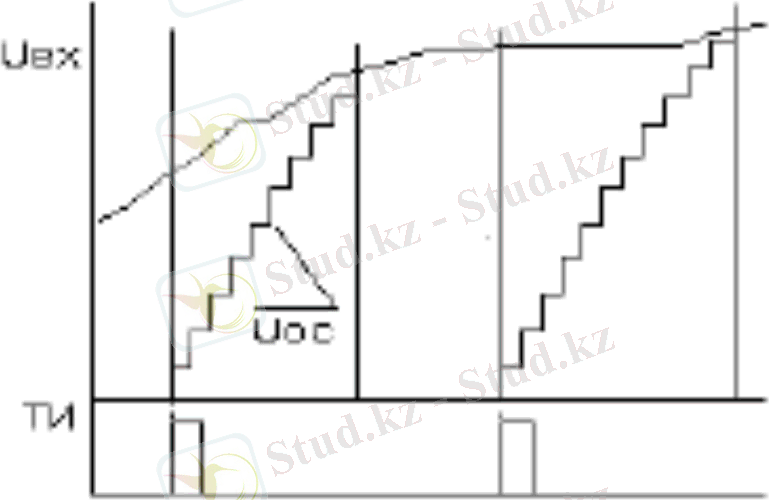 Цифрлық-аналогты түрлендіргіш оң жақтағы сигнал кедергісін тудырады. Бұл кедергі баспалы форманы иеленген. Тактілік импульс келесімен есептегіш жүйеленген импульстік генератордан бастап есептей бастайды (6-сурет) . Есептеу компаратор шығысынан нөлдік сигнал келгенде тоқтатылады. Бұл сигнал оң жақтағы сигнал кедергісі U bx -ке тең немесе одан жоғары болған жағдайда өндіріледі. Есептегіш импульстер саны, мөлшері екілік кодтағы U bx -ке пропорционал болады.