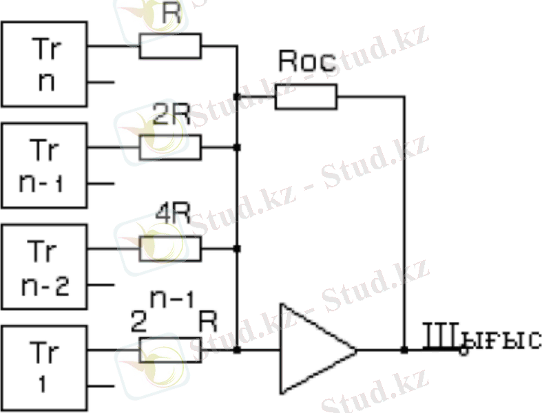 Бұл суретда триггерлер регистр құрады, онда сан екілік коды енгізіледі (8-сурет) . Әрбір триггердің шығысы үшін Операциялық күшейткіштің берілу коэффициенті триггерде сақталуы сан разрядына сәйкес салмақты келеді: