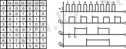 бірден нөлге ауысады, ол екінші триггердің кірісінде 1-ден 0-ге ауысуды тудырады, ол нөлден бірге ауысады (t 2 ) . Үшінші 1-ден 0-ге ауысу пайда болғанан кейін бірінші триггер қайтадан ауысады және т. с. с. Диаграммадан байқайтынымыздай, сегізінші импульстан кейін толып кету жүреді де, санағыш қайтадан алдыңғы қалпына құрылады.