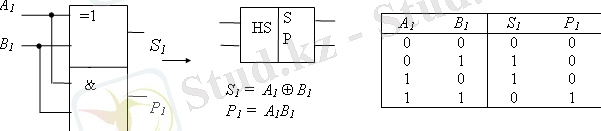 Жартылай қосындылағыш (HS) екі қос сандардың кіші разрядтарының биттарын қосуға қызмет етеді. Ақиқат кестесі бойынша жүзеге асыруға болады. S-қосынды сан, Р - келесі разрядқа тасымалдайтын шығу.