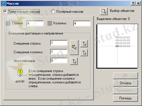 - Егер Array батырмасын басардың алдында, объектілер таңдалған болса, онда Array терезесінде объект санының тізімі пайда болады. Таңдалмаған болса, Select objects батырмасын басып, қажетті объектілерді таңдағаннан кейін Enter батырмасын басып, қайта Array тересесіне оралуға болады.