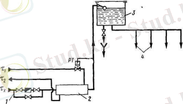 1, 2-жылу желісінің құбырлары; 3-су ысытқыш; 4-температура реттегіш;