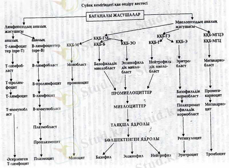 КҚБ-колония (лат. colonia - тұрғын жер, құрылымы бойынша бір тұтастық құратын жасушалар) құратын бірлік: КҚБ-ГМ-моноцит - макрофагтардың және нейтрофилдердің колония құратын бірлігі; КҚБ-ГЭ-гранулоциттер мен эритроциттердің КҚБ; КҚБ-МГЦЭ-мегакариоциттер мен эритроциттердің КҚБ; КҚБ-М-моноциттердің КҚБ; КҚБ-Б-базофилдердің КҚБ; КҚБ-ЭО-эозинофилдердің КҚБ; КҚБ-Г гранулоциттердің КҚБ; КҚБ-Э-эритроциттердің КҚБ; КҚБ-МГЦ-мегакариоциттердің КҚБ.
