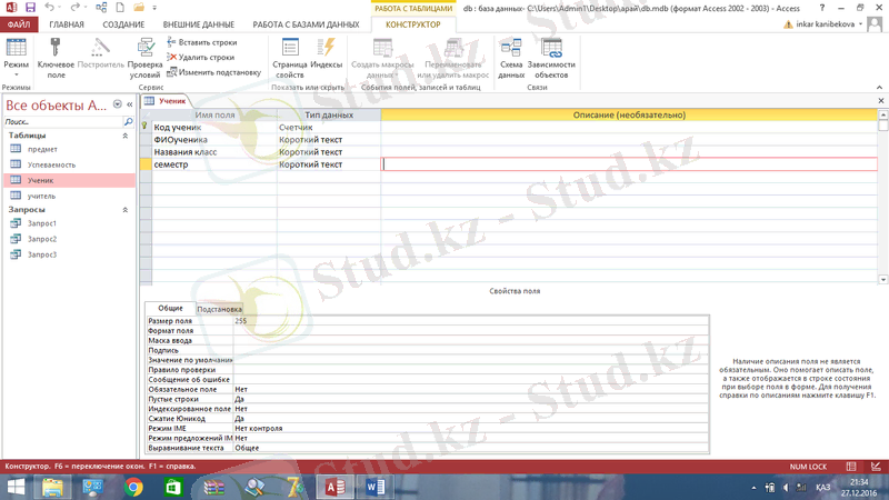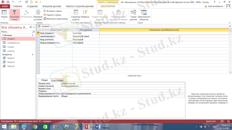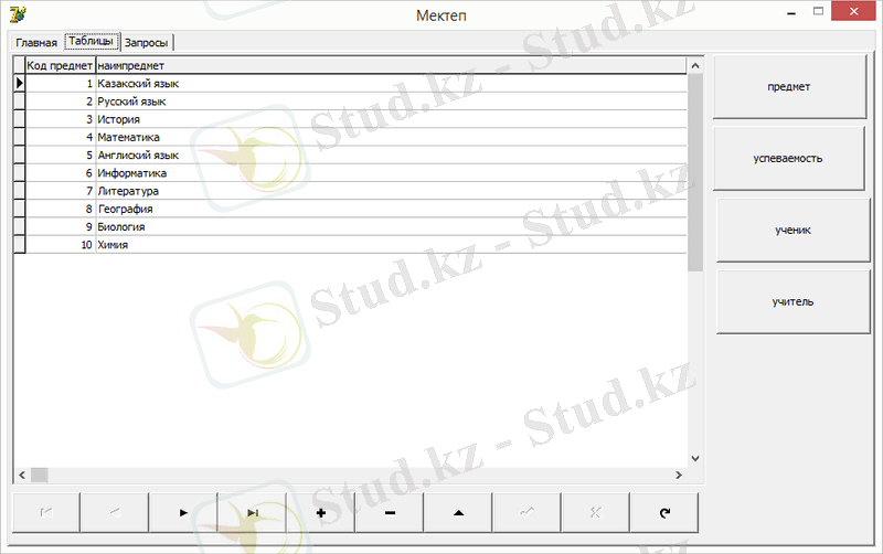 Деректер базасын жобалау MS Access Delphi бағдарламаларында жобаланған. MS Access бағдарламасында деректер базасы 4 кестеден және 3 шығу құжаттары, яғни сұраулардан тұрады. 1 - кесте «Пәндер» кестесі деп аталады.
