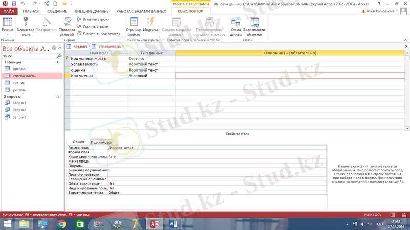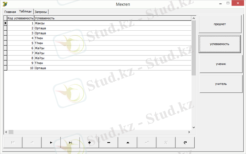 2 - кестеде оқушылардың пәндер бойынша бағалары мен үлгерімі анықталған. «Үлгерім» кестесі келесі суретте көрсетілеген.
