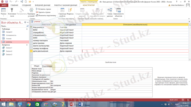 Қарабұйрат орта мектеп-бақшасында өндірістік тәжірибе және деректер базасын жобалау