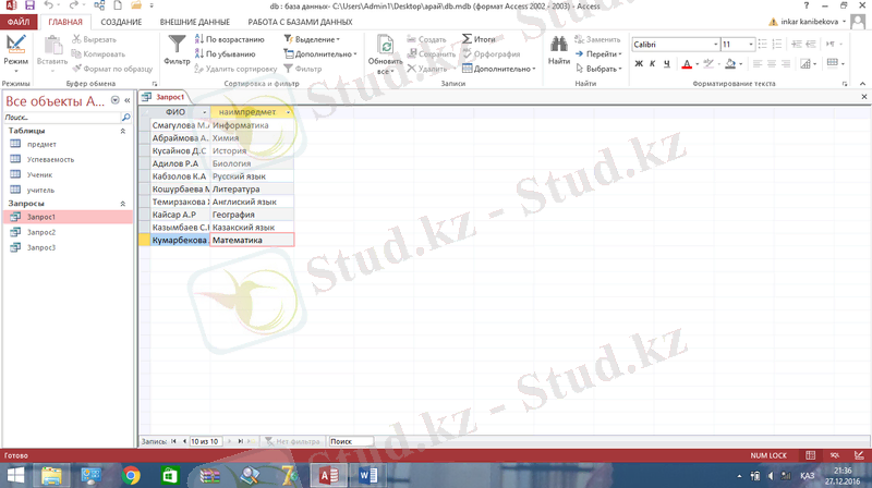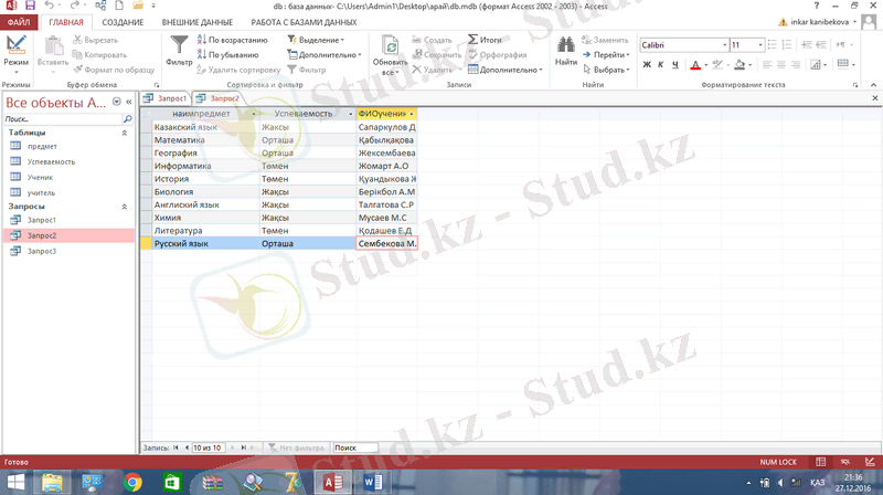 2 - ші сұрау оқушылардың пәндер бойынша үлгерім кестесі шығарылған. «Сұрау 2» төмендегі суретте көрсетілген.