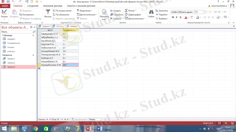 Құрылған деректер базасындағы кестелерден белгілі бір өзімізге керекті шығу құжаттары, яғни сұраулар шығарамыз. 4 - кесте бойынша 3 - сұраулар құралған. 1 - сұрау құрылымы төменде көрсетілген.