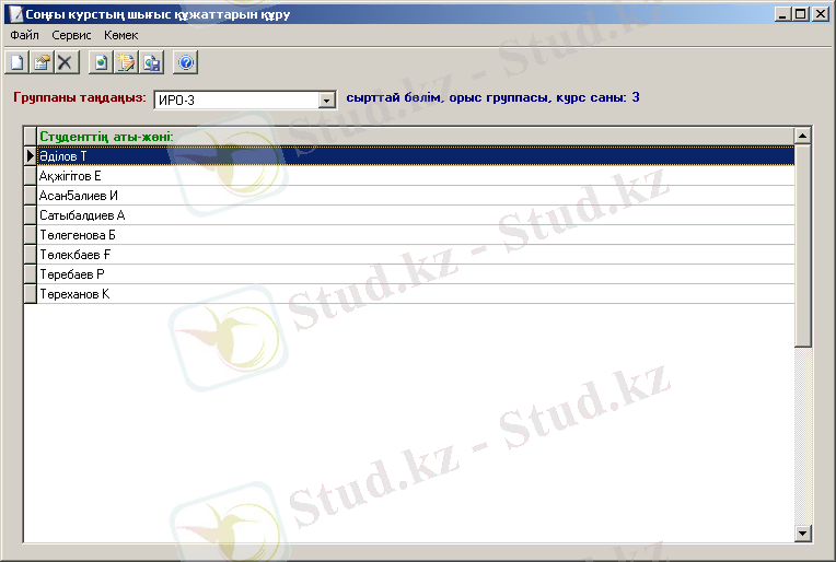Толтырып болғасын алар студентіңізді алып, қосар студентіңізді қосу үшін Сервис🡪Группаның мәлметін өзгерту тізбегін орындаймыз. 3-терезе қайтадан ашылады, бірақ мұнда біз таңдаған группаның мәлметтері тұрады.