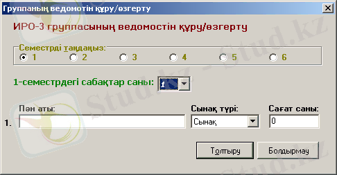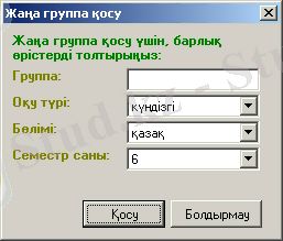 Осы терезені толтырып болғаннан соң, группаның мәлметін толтыру терезесі ашылады. Біз мұнда аз дегенде алты студент енгізбей терезені жаба алмаймыз.