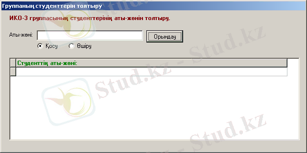 Группаның тізім берілген компонентте группаның тізімін таңдау арқылы сол группаның студенттері туралы мәлмет алуға болады. Программада одан басқа ыстық бернелер қарастырылған. Бұл бізге жұмыстың тез оырндауға мүмкіндік береді.