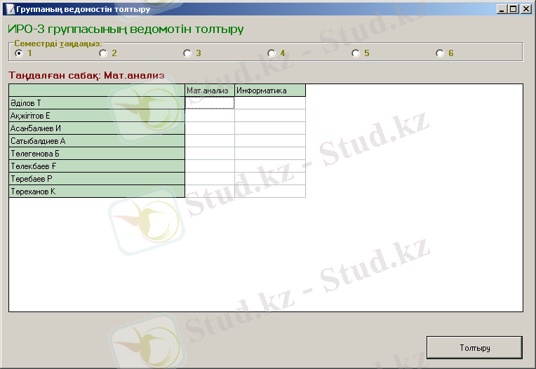 Енді группаның ведомостін толтыруға кіріссек. Ол үшін Сервис🡪Группаның ведомостін толтыру тізбегін орындаймыз. Содан соң 6-суреттегідей терезе ашылады. Оған группаның алған бағаларын енгіземіз.