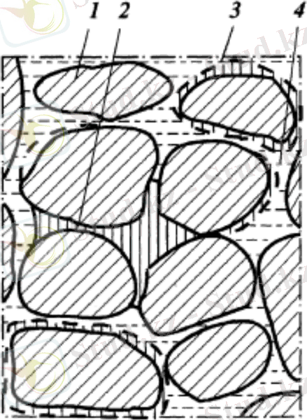 1-сурет. Кеуекті ортаның қимасы: 1 - жыныс түйіршіктері; 2 - тұйыққа тірелген кеуектегі қалдық мұнай; 3 - қабыршақты мұнай; 4 - су