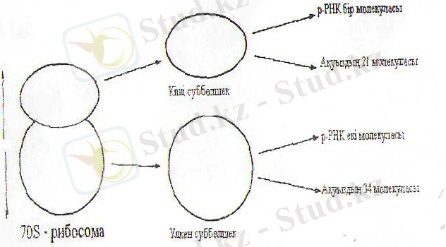 молекуласы қосылады, ат үлкенге-тРНК молекуласы. Оның кіші суббірлігінде трансляция (көшіріп аудару) процесі жүреді, ал үлкен бөлігінде аминоқышқылдар жинақталып, ақуыз молекуласы түзіледі. Үлкен суббірлігі эндоплазмалық тордың липопротендік мембранасына рибосомалардың бекінуіне қатысады. Бір ақуыз молекудасының синтезне бірнеше рибосома қатысады, оны полисома деп атайды. Бактериялардан сүтқоректілерге дейінгі ағзалардың бәрінің рибосомалары үлкендігі, кұрылысы және химиялық құрамы жағынан ұқсас. Олар ақуыз бен РНК-ның бірдей мөлшерінен тұрады. Негізінен, рибосомалар мен рРНК ядрошықта синтезделеді. Рибосоманың құрамына кіретін ақуыздар алуан түрлі болады. Прокариотық рибосомада шамамен 55, ал эукариоттық рибосомада 100-ге жуық ақуыз кездеседі. Рибосомаларда липидтер болмайды. Ақуыздарды жедел синтездейтін жасушаларда рибосомалар көп болады. Сол сияқты жасушалардың өсу дәуірінде де цитоплазмада, эндоплазмалық торлардың мембраналарына бекінген, көптеген бос рибосомалар байқалады.