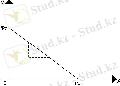 Бұл теңдеу бюджеттік сызық деп аталатын жазықтағы түзу сызықты анықтайды (4. 6 сурет) . І/р х мәнінде бюджеттік сызық. ОХ осінен өтеді, ал ОҮ осьті І/р у мәнінде. Бюджеттік сызықтың ылдилығын анықтау үшін (4. 1) теңеуді у қатысты шешуге болады, яғни