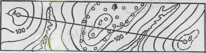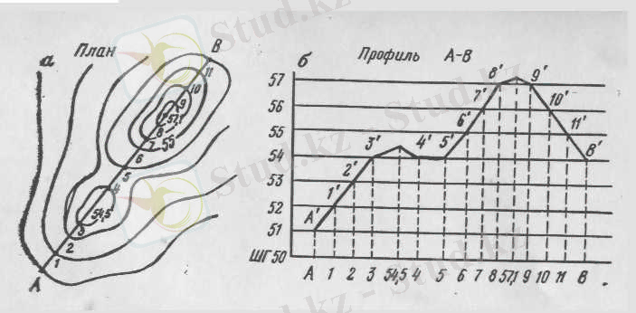 Топографиялық картада немесе планда АВ сызығы бойынша жердін, профилін салу керек болсын. Профильді кез келген берілген масштабта, демек карта масштабында да салуға болады. [8]