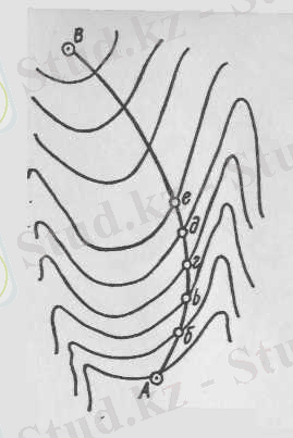 Трассаны берілген еңістікпен жобалау. Топографиялық карталарда темір және автомобиль жолдарын, каналдарды және тағы басқа да созылыңқы объектілерді жобалауға тура келеді. Осындай келешектегі жобалау кұрылыстарының трассасын белгілі шектік еңістікпен белгілейді (трассаның көлбеу бұрышы берілген шамадан, мысалы, 1, 5°-тан артық болмауы тиіс) . Айталық, картада осындай келешектегі трассаны А және В нүктелерінің арасында белгілеп, оны жүргізу керек (12-сурет) болсын. Картадағы табан графигі бойынша берілген көлбеу бурышқа (1, 5°) сәйкес шаманы табамыз да оны өлшеуіштің ашасына аламыз. Берілген А нүктесінен осы өлшеуіштің шасымен келесі горнзонтальды басып өтіп жобаланатын сызықтың б нүктесін табамыз, сонда Аб сызығының еңістігі берілген 1, 5° көлбеу бұрышқа тең болады. Одан кейін өлшеуіштің бір ашасын табылған б нүктесінде ұстап тұрып, келесі горизонтальды белгілеп алып, b нүктесін табамыз. ) Сөйтіп жобаланатын сызықтың келесі bг , гd және dе кесінділерін табамыз. е нуктесінен В нүктесіне дейін тұзу сызық жүргізуге болады, өйткені осы учаскедегі еңістік берілген шекті еңістіктен аз болады.