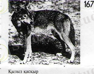 5. ҚЫЗЫЛ ҚАСҚЫР (Cuon alpinus) - қасқыр туқымдасына жататын жыртқыш аң. Қазақстанда Тянь-Шань мен Жетісу (Жоңғар) Алатауында кездеседі. Дене тұрқы 100 - 110 см, құйрығының ұз. 45 - 50 см. Құйрық жүні үлпілдек. Арқасы қызыл қоңыр, екі бүйірі солғын қызыл түсті. Қ. қ. жаз айларында алып және субальпі белдеулерінде 2500 - 4000 м биіктікте, таутеке мен арқар жайылатын жерлерде қоныс аударып тіршілік етеді. Баспана ретінде түрлі қуыстар мен басқа аңдардың тастап кеткен індерін пайдаланады. Көбеюім жөнінде деректер аз. Мыс, Пекин хайуанаттар паркінде Қ. к-дың қаңтар айында ұйығып, 60 күннен кейін көбіне 3 - 4 күшік туатыны анықталған. Көбею кезінде үйірі-мен (5 - 10, кейде 30) жүреді. Қ. қ. - терісі бағалы аң. Саны өте аз, сонғы 40 жылда Қазақстанда Қ. к-дың кездескені туралы дерек жоқ. Қ. қ. Халықар. табиғат қорғау одағы мен Қазақстанның «Қызыл кітабына» енгізілген.