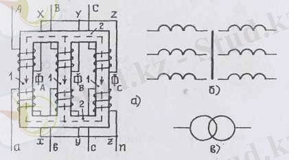 1-сурет. Үш фазалы трансформатордың сұлбалық құрылысы (а) мен шартты белгілері (б, в) .