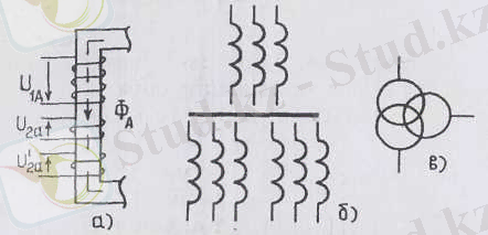 4-сурет. Үш орамалы трансформатордың бір фазасының сұлбалық кұрылысы (а) мен шартты белгілері (б, в) .