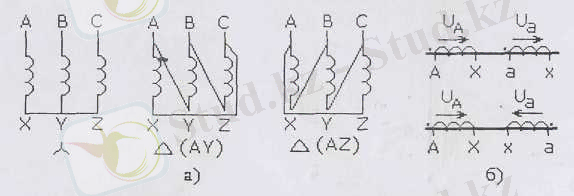 Үш фазалы трансформатордың біріншігәр және екіншігәр орамалары жұлдызша немесе үшбұрышша жалғанған. Әрине жалғану түрлері орамалардың және электр қабылдағыштардың номинал кернеулерімен анықталады. Жалпы алғанда, егер орамалардың басы мен аяғы анықталған болса, оларды жалғаудың тек қана үш түрі болуы мүмкін (5-сурет) . Мұнда кернеулердің фазалары орамалардың орау бағытына байланысты болатыны белгілі. Егер орамалар бағыттас оралған болса, онда олардың кернеулері де (ЭҚК тудырған) бағыттас, ал қарама - қарсы оралған болса кернеулері де қарама - қарсы бағытта болады (5, б-сурет) .
