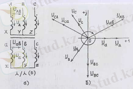 Біріншігәр және екіншігәр орамалары жұлдызша және бағыттас жалғанған (6, а-сурет) трансформатордың векторлық диаграммасы 6, б-суретте келтірілген. Мұндағы біріншігәр және екіншігәр орамалардың кернеулерінің ара қатынасы