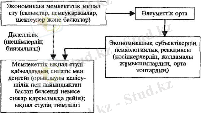 Мемлекетгік реттеуді болжайық. Осыңда жеке таң-даудың еріктілігі көпшіліктің мүддесін білдіру еркімен ауыстырылған. Ең жақсы жағдайда мемлекетгік реттеу игіліктер мен қызмет көрсетулерді көбейтпей-ақ тиімді қайта таратуы мүмкін. Сонымен қатар тарих, өкінішке орай, экономикалық тандаудың қүқығын үзақ мерзімді шектеу азаматтардьщ енжарлығьш, дербес іс-әрекетгерге қабілетсіздігін, биліктің қүдіреттілігіне үмітін туғыза-тындығын дәлелдейді.