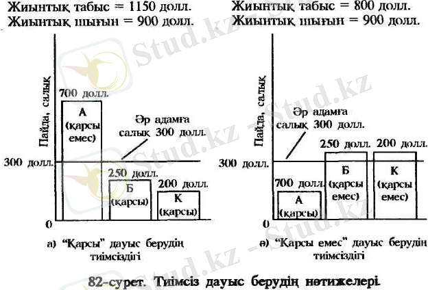 "Қарсы емес" шиімсіз дауыс берудің мысалы. Өнді-рістік жиынтық шығын жиынтық табыстан жоғары болғанымен, берілген қоғамдық тауар қабыл алынатын кездегі қарама-қарсы жағдайды көрсететін мысалды ой-ластыруға болады. 82ә-суретте осы жағдайды бөлшектеп көрсетіп түр. Және қайтадан А, Б және К 900 долл. қүрайтын қоғамдық тауардың қүнын өзара теңцей етіп бөліседі. Осы кезде А қоғамдық тауарға төлеуден бас тартпайды, ал оған тек қана 100 долл. жаратуға дайын. Сондықтан да олар осы қоғамдық тауар үшін дауыс бе-реді, ал А қарсы болады. Сайлаудың нөтижесінде 900 долл. тұратын қоғамдық тауар 800 долл. тең жиынтық табыс әкеледі (100 долл. A + 350 долл. Б + 350 долл. К) . Демек, осы қоғамдық тауарға ресурстардың салынуы тиімсіз болады.