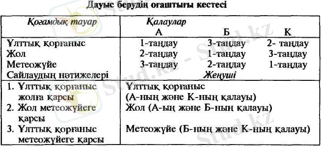Дауыс берудің нәтижелері. Шешімді көпшілік қабыл-даған кездегі үш болжамды таңцаудың нәтижелерін қа-растырайық. Ең алдымен сайлауда ұлттық қорғаныстың және жолдың жаідайын қарастырайық. Кестеде көрін-гендей ұлттық қорғаныс жеңіске жетеді, өйткені сайлау-шылардың көпшілігі - А және К жолға қараганда ұлттық қорғанысты тандайды. Осы туралы кестенің төменгі жаіы, қорытындылар шыгатын жерде 1-жол дәлелдейді. Одан кейін қоғам жодды немесе метеожүйені таңдайтын-дьны туралы білу үшін біз сайлау өткіземіз және 2-жол көрсеткендей сайлаушылардың көпшілігі - А және Б ме-теожүйеге қарағавда жолды таңдайтынын көріп отырмыз.