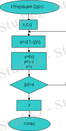 Сосын теңдеудің түбіріне кез келген Х0 бастапқы жуықтау беріпk=1, 2, … формуласымен х1, х2, …, хn нүктелер тізбегін құрамыз. Бұл тізбек x=z түбіріне жинақталуы керек. Егер limXk=z болса, онда z нүктесітеңдеуінің түбірі бола алады. Итерация әдісінің жинақтылық шартыжәне бастапқы жуықтау кез келген болады. Итерациялық процесс берілген дәлдікке жетуі үшіншарты орындалуы керек.