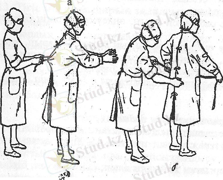 7. Халаттың арқасындағы бауларын санитарка байлайды.