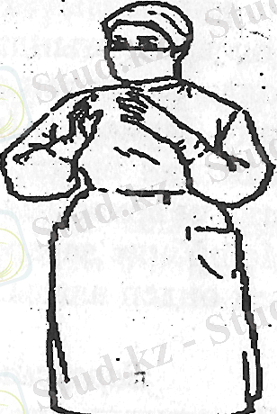 5. Кейін он алақанымен халаттың жағасын ұстап тұрып сол қолына киеді