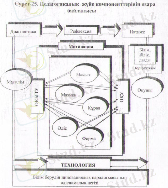 25-суретте ғалымдар Ж. Қараев, Ж. Кобдиқовалардың зерттеулеріне сүйеніп, педагогикалық жүйе компоненттерінің өзара байланысы керсетілді.