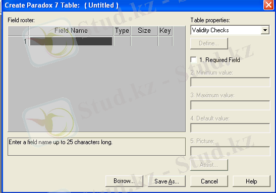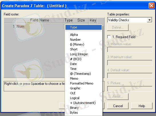 Содан кейін өрістің типін (Type) анықтау керек. Өріс типін тышқанның оң жақ түймешелігін немесе бос орын түймешесін басу арқылы контекстік менюден таңдап алуға болады. Paradox 7- де мынандай мүмкін типтер бар: