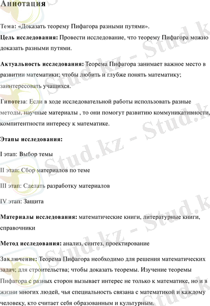 Бұл жобаның мақсаты зерттеу жұмысында Пифагор теоремасын