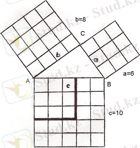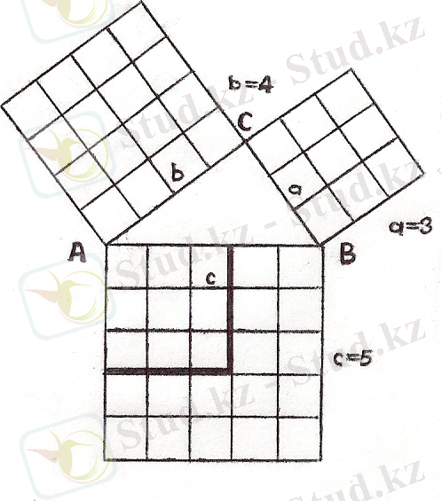катеттерге салынған квадраттардың аудандарының қосындысы гипотенузаға салынған квадраттың ауданындай болады.
