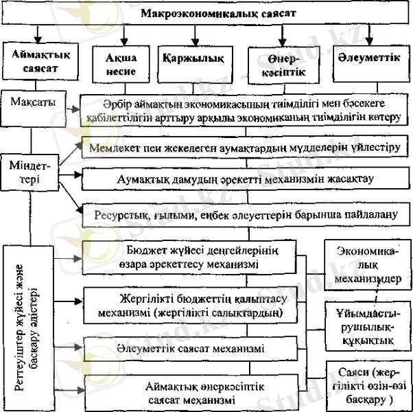 Аймақтық саясаттың мәні мен міндеттері және оларды жүзеге асырудың өзіндік механизмдері бар. Макро-экономикалық саясаттың құрамдас бөлігі бола отырып, аймақтық саясат әрбір аймақтың экономикасының тиімділігі мен бәсекеге қабілеттілігін арттыру арқылы экономиканың тиімділігін көтеруді өзінің басты мақсаты етіп қояды. Қойылған мақсатқа жету үшін, әрине, міндеттердің қойылуы шарт. Олардың қатарына: мемлекет пен жекелеген аумақтардың мүдделерін үйлестіру, аумақтық дамудың әрекетті механизмін жасақтау, сонымен қатар аймақтың ресурстық, ғылыми, еңбек әлеуетін барынша пайдалану жатады. Осы суреттен көрініп тұрғанындай, аймақтық саясаттың мақсаты, міндеттері мен жүзеге асыру әдістері мемлекеттік реттеудің басқа бағыттарымен өзара тығыз байланыста жүзеге