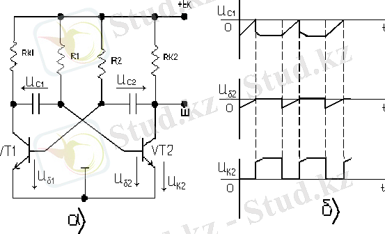 23. 3-сурет. Автогенератор режиміндегі мультивибратордың схемасы (а) мен уақыттық диаграммалары (б)