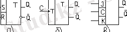 23. 1-сурет. Интегралдық триггерлердің шартты белгілері: а - RS-триггер; б - Т-триггер; в - JK-триггер