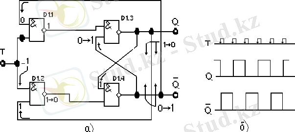 сигналы D1. 1 мен D1. 3-тің сигнал өткізулеріне тиым салады. Енді Т-ену жолында “1” сигналы пайда болады десек, ол тек D1. 2 элементінен ғана өтіп, оның шығу жолында “0” түрінде пайда болады. D1. 1-дің шығыс жолындағы “1” өзгеріссіз қалады. Келесі кезеңде D1. 2-нің шығу жолында пайда болған “0” D1. 4-тің, яғни триггердің инверсиялық шығу жолында “1”-дің пайда болуына әкеп соқтырады. Енді D1. 3-тің екі ену жолында да “1” болғандықтан (аталған